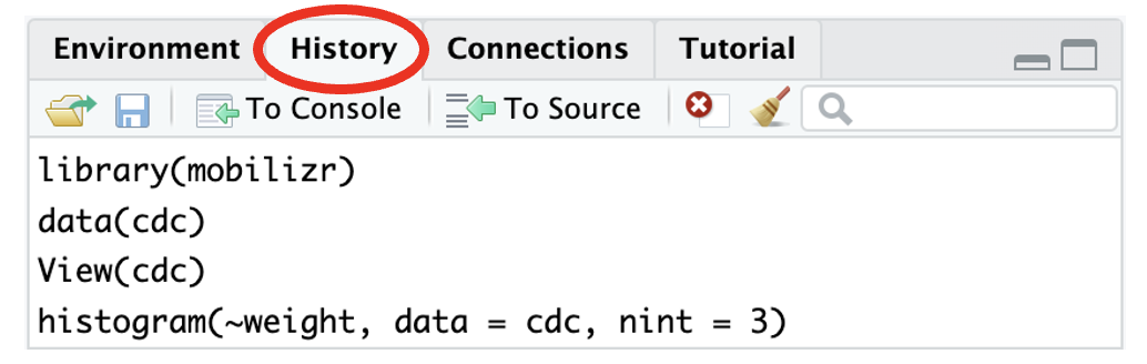 Find the History tab in RStudio and click on it. Figure out how to use the information to reload the