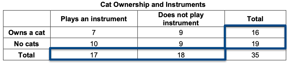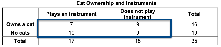 Plays an instrument Does not play instrument Total Owns a cat 7 9 16 No cats 10 9 19 Total 17 18 35  -