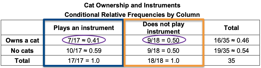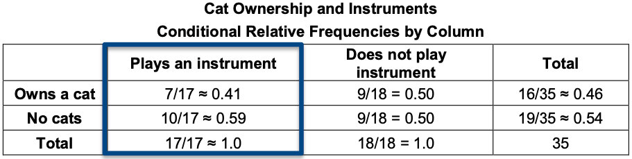 Note: These are conditional relative frequency by column. We can also calculate conditional relative frequencies by row if we were interested in knowing the difference in playing an instrument for those who own cats versus those who do not.
