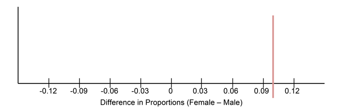 Draw a dotplot on the board labeled “Difference in Proportions.” Include a vertical line at 10% to represent the actual difference in gender survival rates in real horror movies (see example below).