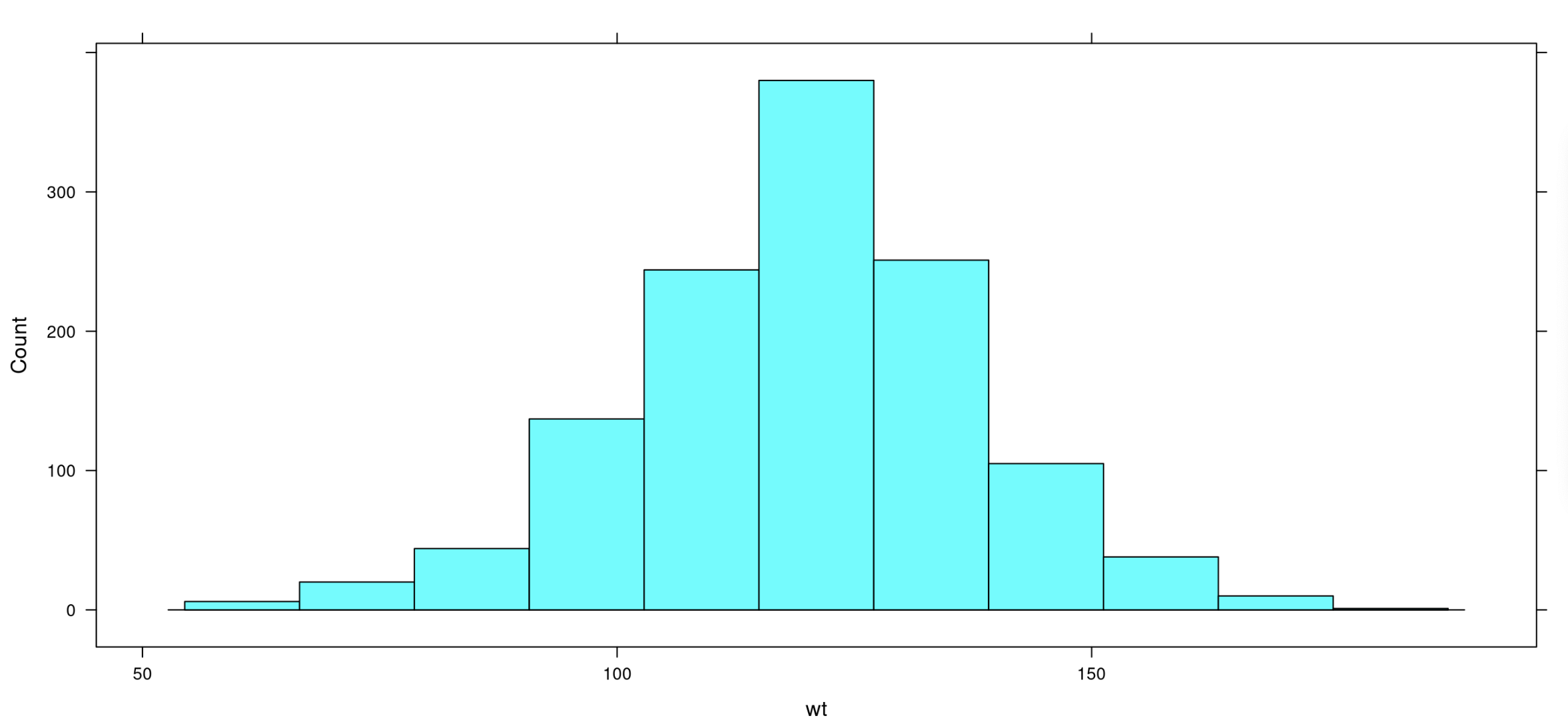 Create histograms using the variables shared by student teams. There are a few variables that look normally distributed, such as the birth mother's heights. We will investigate the babies’ birth weights.