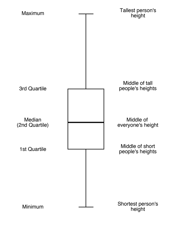 When you finish, you should have five lines, which represent the five-number summary: minimum, first quartile, median, third quartile, and maximum. Draw a box using the first and third quartiles as the edges of the box. The median line will be contained within the box. Extend a line from the first quartile down to the minimum and extend a line from the third quartile up to the maximum. Your class’s boxplot should look similar to the following: