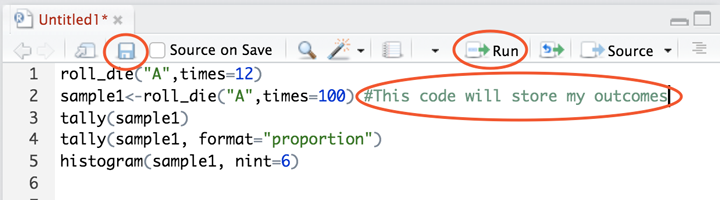 nint = 6so that the resulting histogram has six bars. Answer: If the die is fair, each of the bars in the histogram should be roughly the same height.histogram(sample1, nint = 6)Note to teacher: Show students how to save an RScript. Inform students that they can take notes on their RScript by including a hashtag (also known as a pound sign or #) at the beginning of the note. Data scientists refer to these types of notes as “code comments” or simply “comments”. See image below.