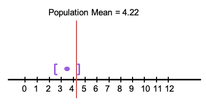 For example: The purple dot represents a sample mean of 3.5. The AMOUNT we have chosen for this particular case is 0.8, so the lower bracket is 0.8 below the sample mean, and the upper bracket is 0.8 above the sample mean. Notice that the population parameter is included within the brackets.