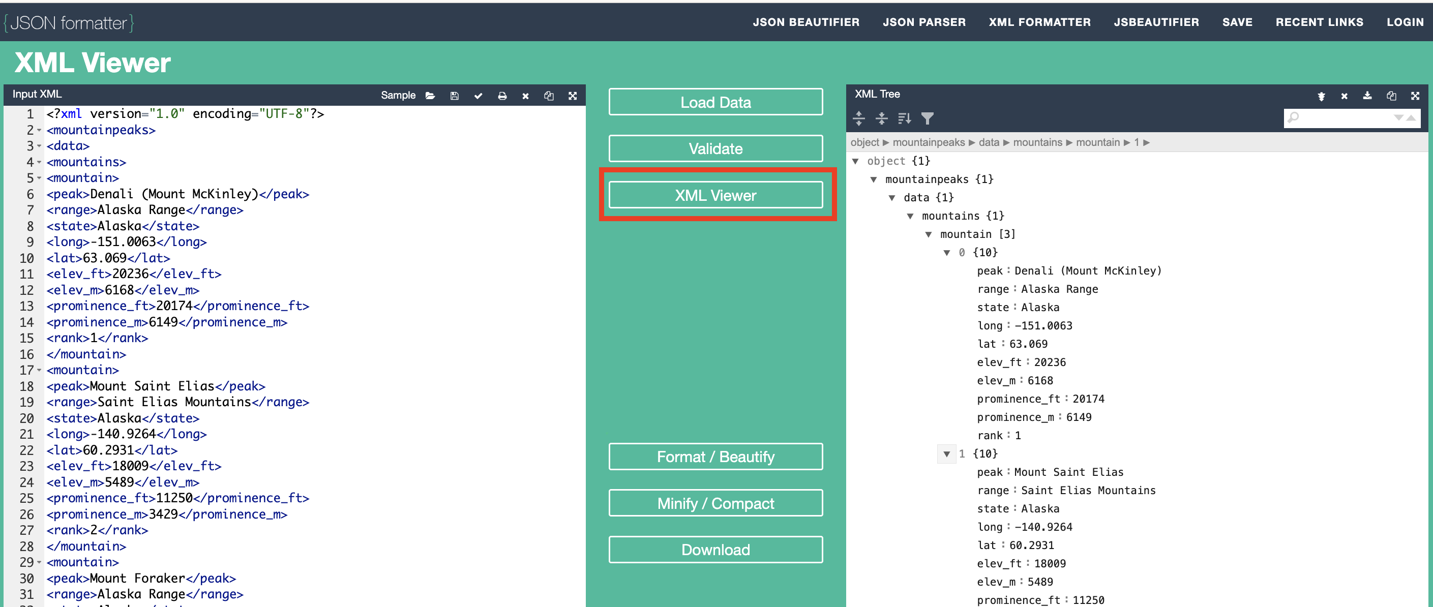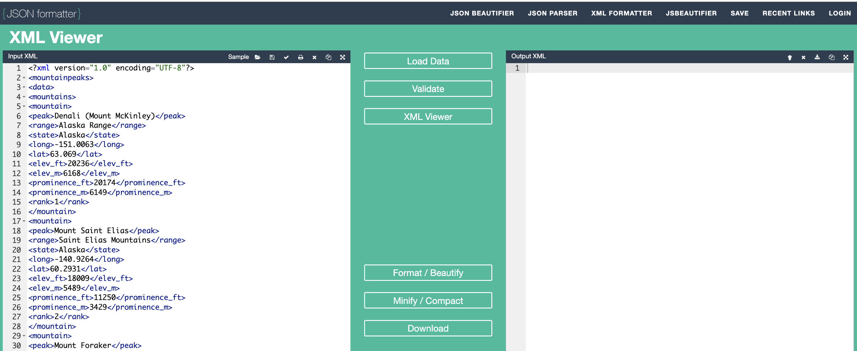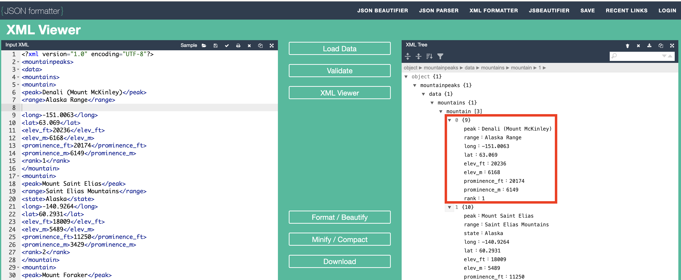 Why are certain XML tags indented in the XML version of the data? Answer: The indentations help us visually see the structure of the data. For example, all the mountains are contained in the <data> section, but are further tagged by each particular mountain within the <mountain> and </mountain> tags. All information stored between those two tags will be displayed as one row of the HTML table.