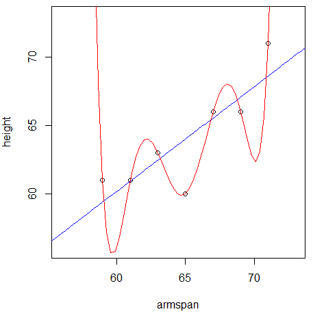 trainingpoints, and two curves representing the value of height each model would predict given a value of armspan.