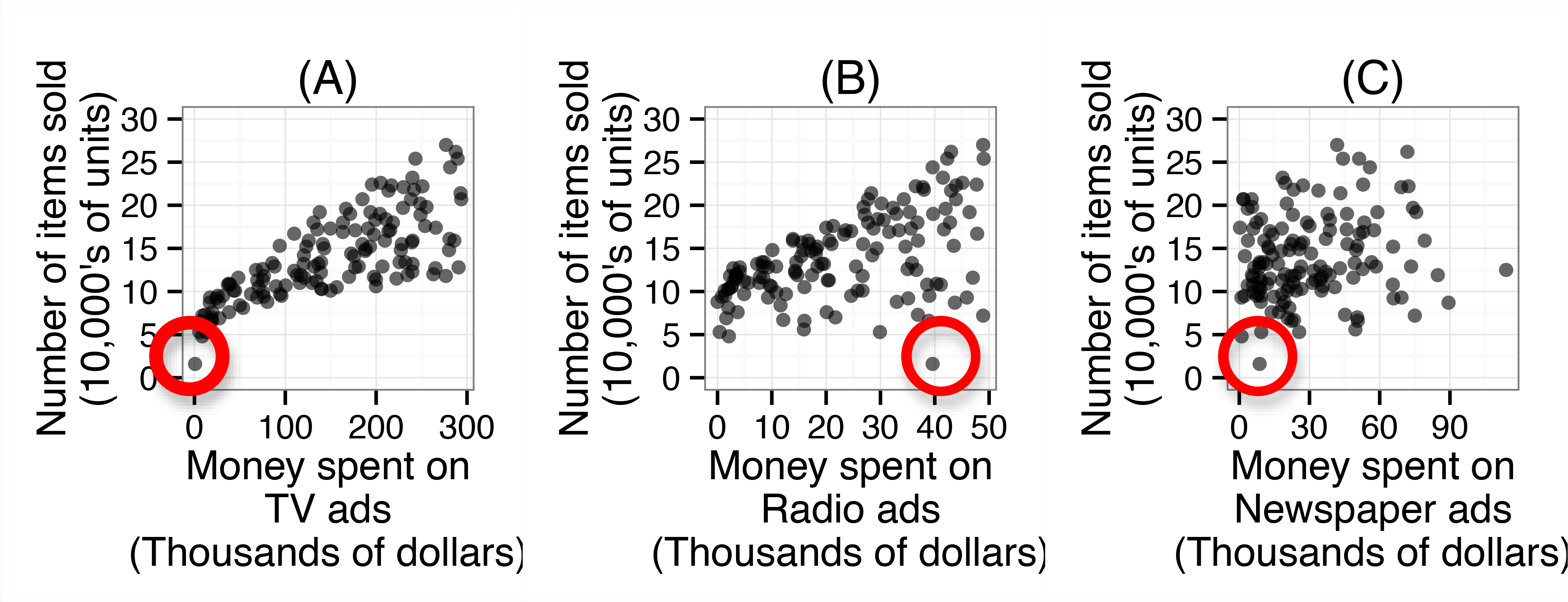 These 3 plots show the number of items sold by a retailer (in 200 different markets) and the amount of money the company spent on TV, Radio and Newspaper advertisements.