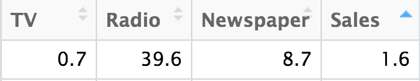 Each observation has 4 variables: (1) The number of items sold (in 10’s of thousands of units), (2) the money spent on TV ads (in thousands of dollars), (3) the money spent on radio ads (in thousands of dollars), and (4) the money spent on newspaper ads (in thousands of dollars).