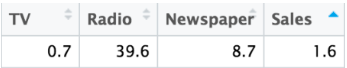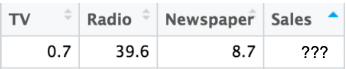 Reveal that RStudio calculated the mean squared error for different combinations plus the single models, and the results are displayed on the table below. This means that, for example, when using the TV model to predict number of items sold, our predictions will typically be off by about 3.373579 (in 10,000s) of units or 33,736 units. Then ask students the questions below.