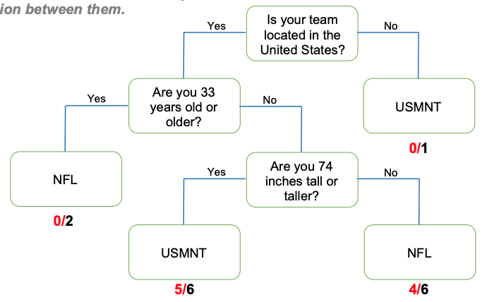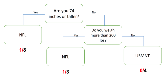 Distribute the Make Your Own Decision Tree handout (LMR_U4_L17) and give students time to come up with their own decision trees based on the training data they are given. Students may work in pairs or teams. They should follow the directions on page 1 of the handout and come up with a series of possible yes/no questions that they could ask to classify each player into his correct league (the NFL or the USMNT).