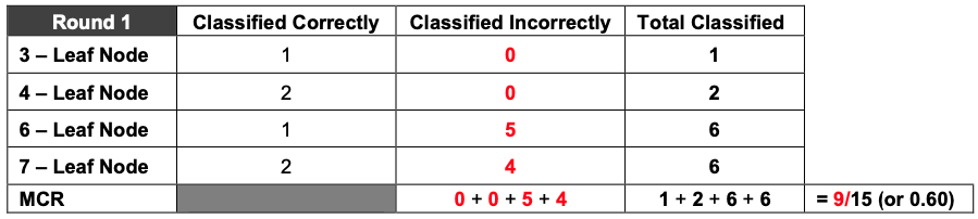 Refer back to your tallied decision trees and correct/incorrect classification tables from the previous lesson. What were the overall proportion of incorrect classifications for Round 1? What about for Round 2? Answers will vary. If all activity player stats cards were used then the MCR for Round 1 is 9/15, or 0.60, and for Round 2 is 2/15, or 0.13. You can reference the decision trees and tables from the previous lesson so that students can see the connection between them.