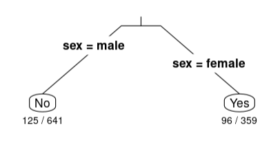 What does the output 125/641 represent? Answer: The 641 tells us that six-hundred-forty-one people were classified as not surviving based solely on the fact that they were male. The 125 represents people who were misclassified (they actually survived), which means that 516 people were classified correctly (they indeed did not survive).