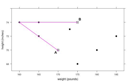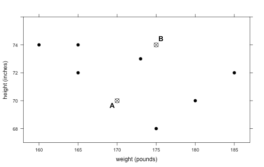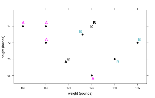 x-value for A = (160 + 165 + 165 + 175)/4 = 166.25 y-value for A = (74 + 72 + 74 + 68)/4 = 72 x-value for B = (173 + 180 + 185)/3 = 179.3 y-value for B = (73 + 70 + 72)/3 = 71.67 new A = (166.25, 72) new B = (179.3, 71.67)  -