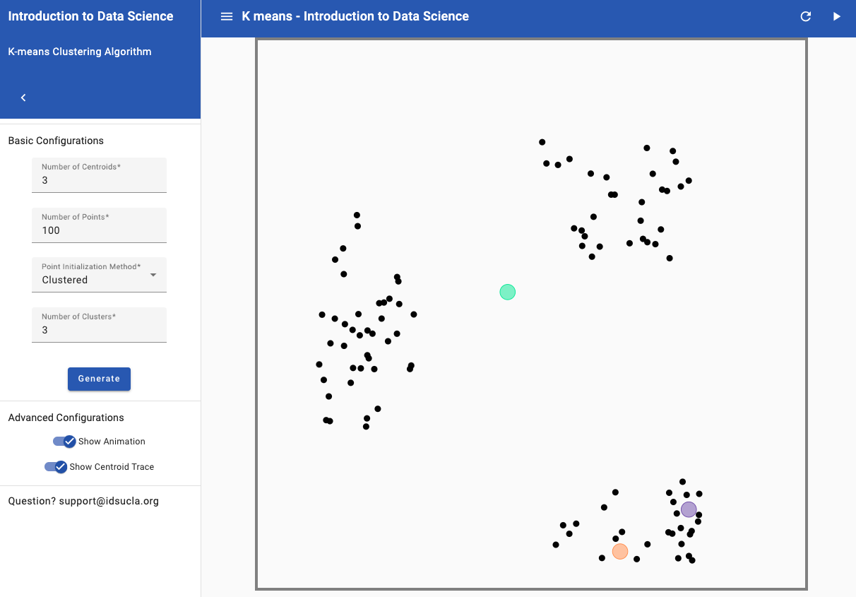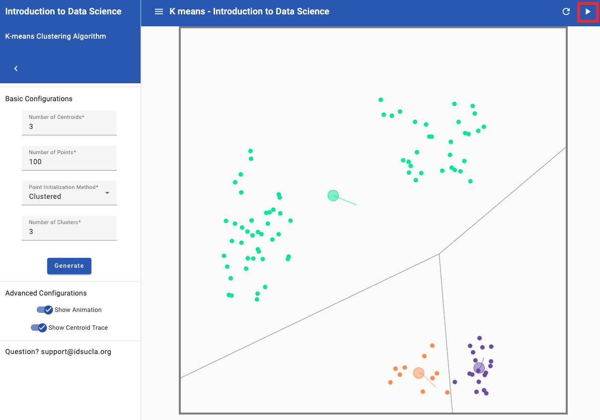 In the app, "centroids" is the academic term for cluster centers. For this example, we will use 3 centroids and choose a "Clustered Initialization" with 100 points and 3 Clusters. See image below for how to adjust the settings.